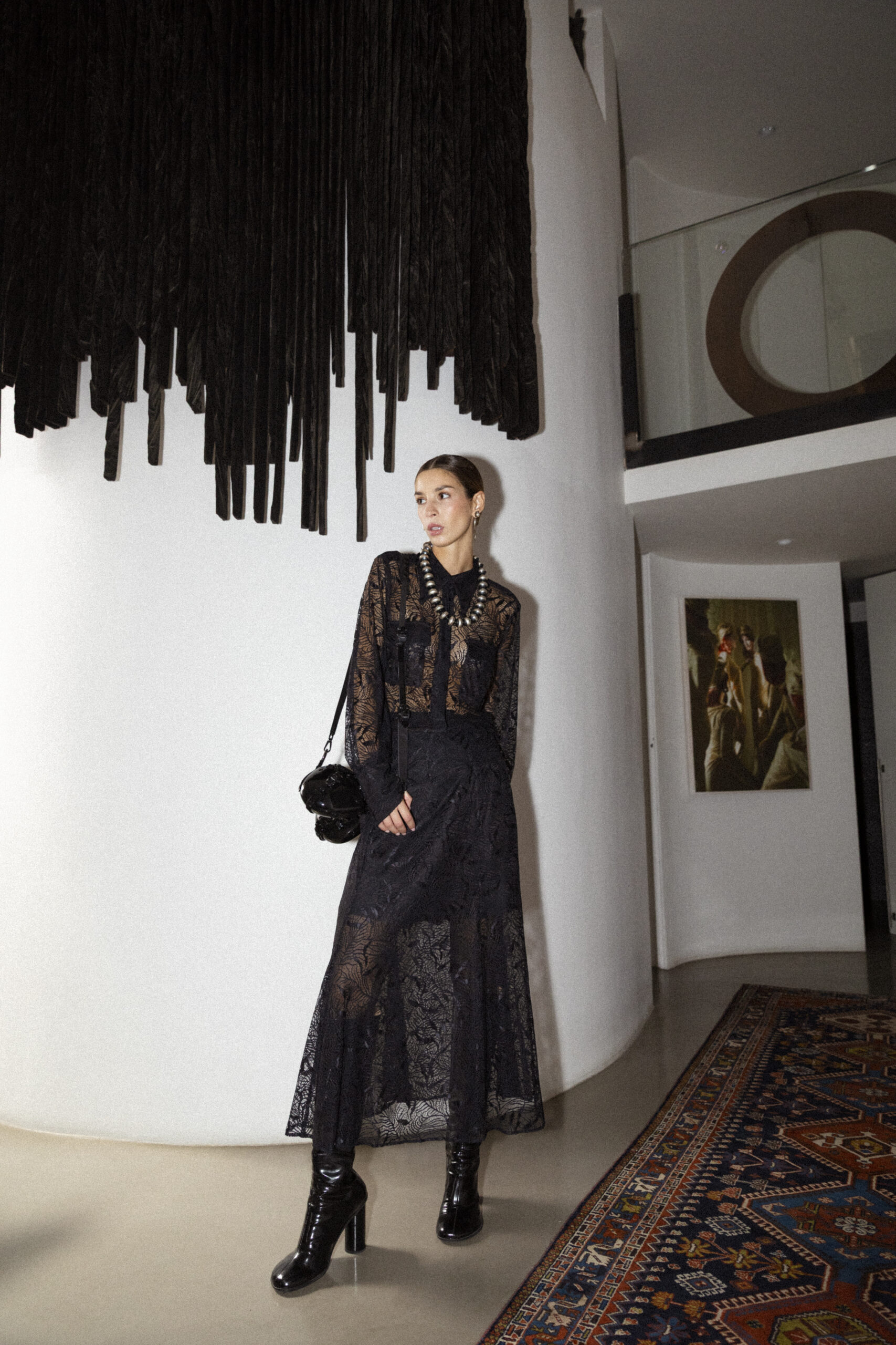 Realizzata in pizzo nero, questa camicia dal taglio sartoriale ha lunghe e ricche maniche chiuse da alti polsi “alla francese”. lungo collo maschile, tasche applicate sul petto, abbottonatura centrale nascosta e sprone sul retro per aumentarne la vestibilità. Cuciture all’inglese. Made in Italy .