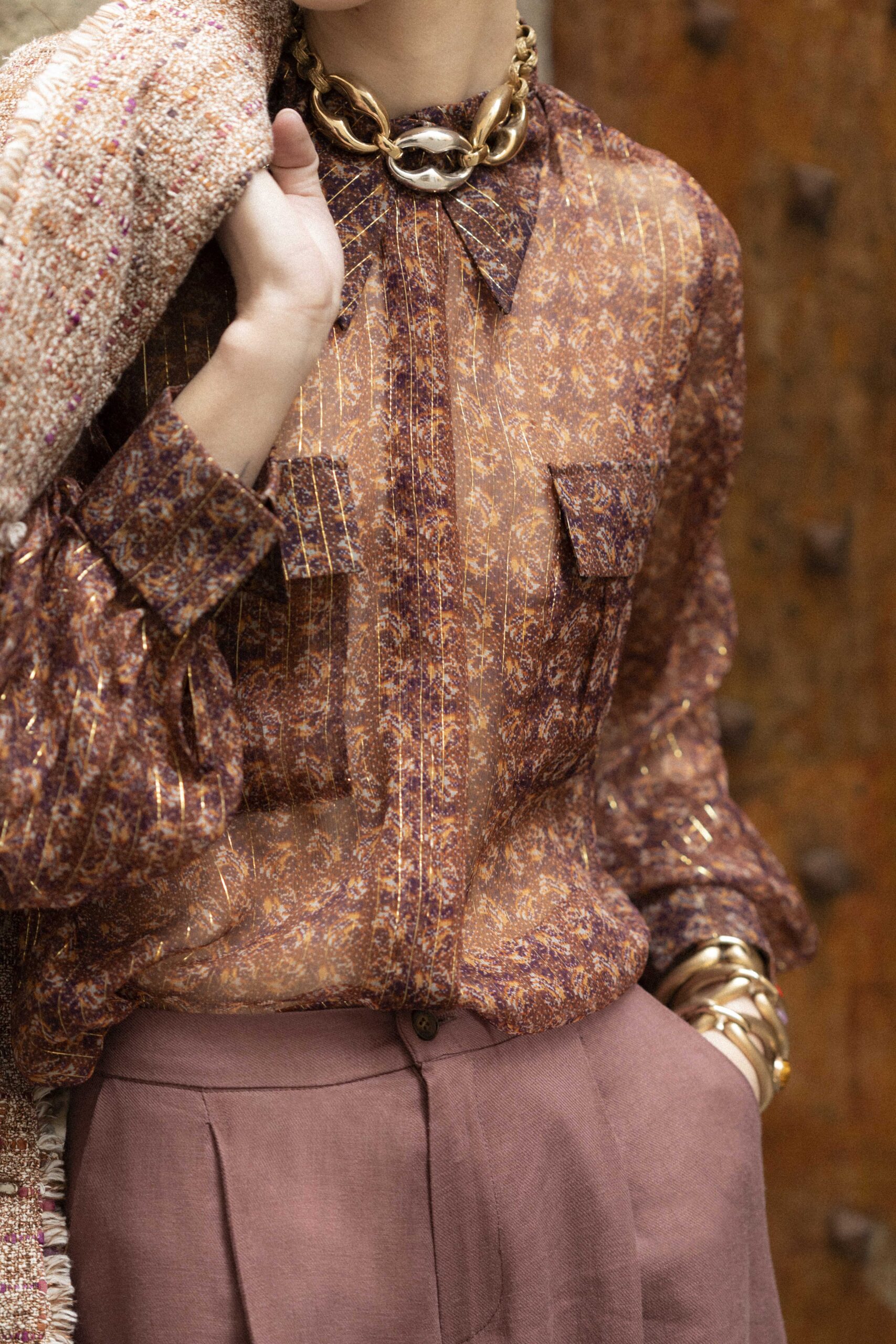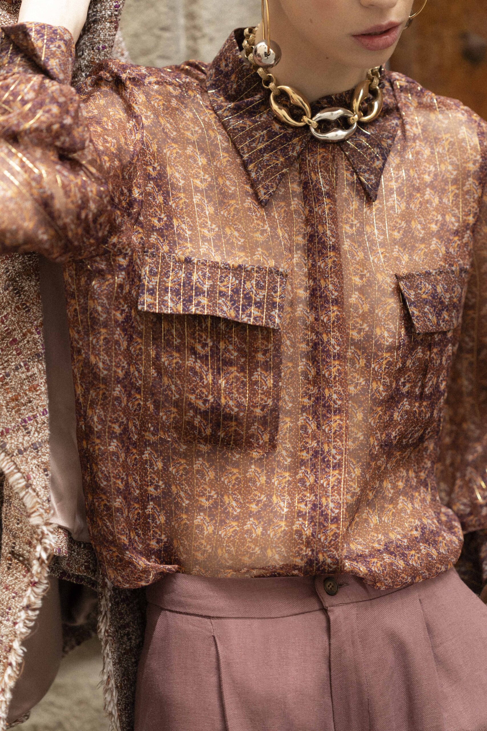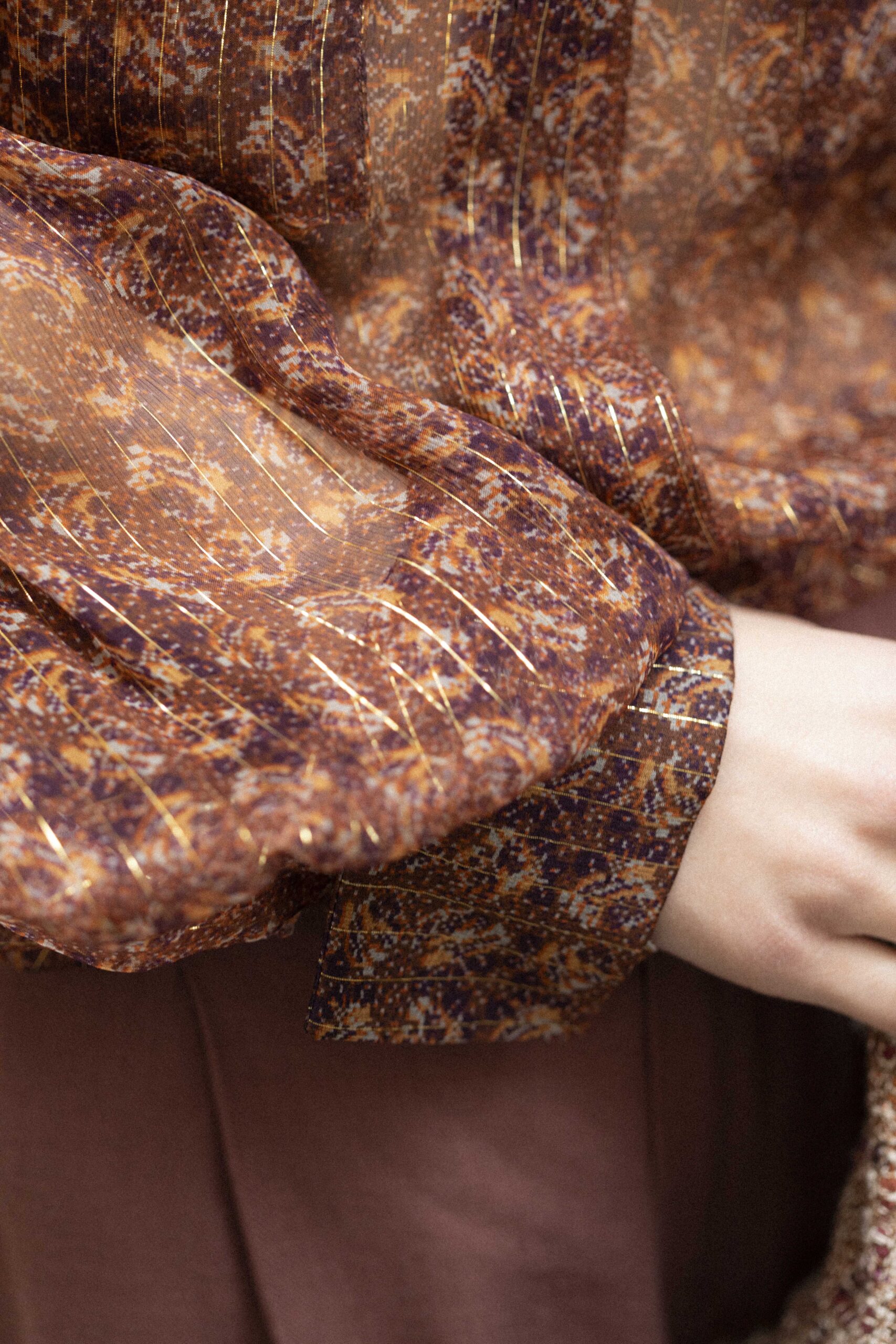 Camicia Classica Silk Chiffon Fantasy Lurex Riga Oro Fondo Bronzo