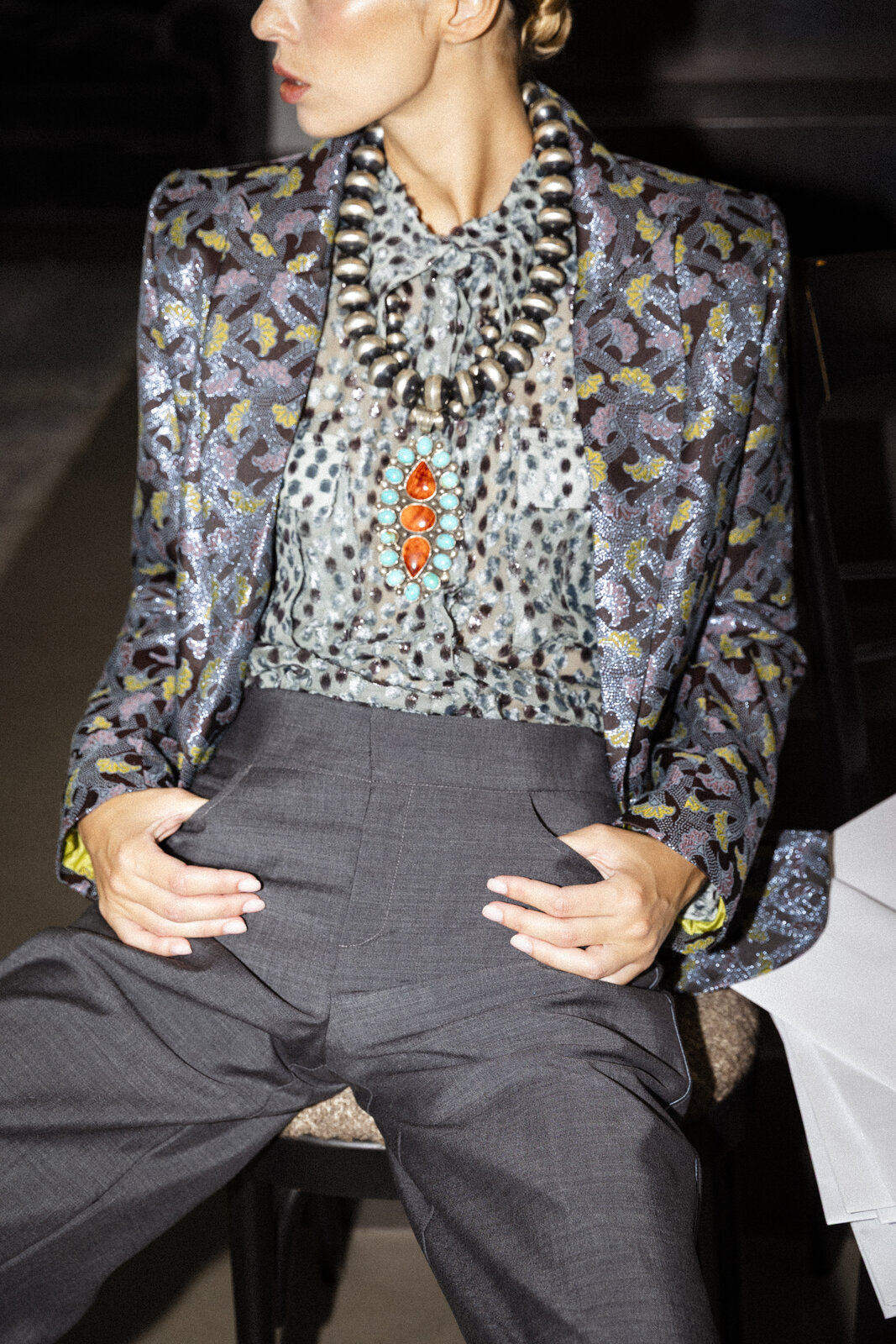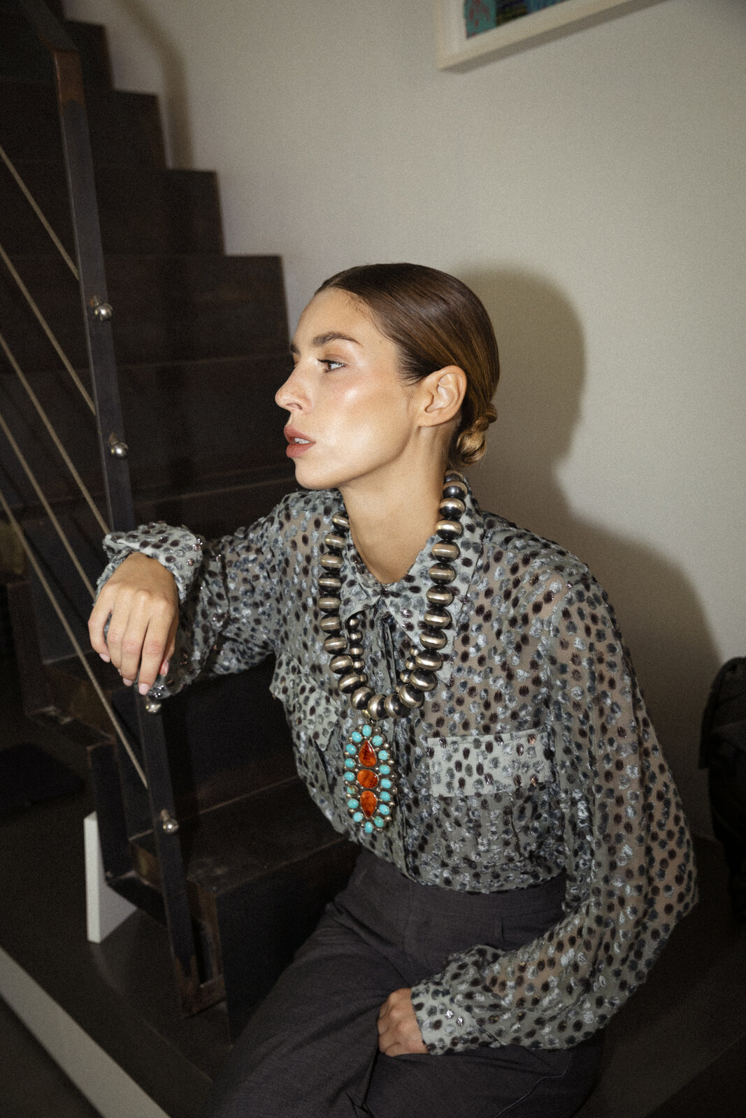 Realizzata in chiffon di pura seta punteggiato di velluto e lurex, questa camicia dal taglio sartoriale ha lunghe e ricche maniche chiuse da alti polsi “alla francese”. lungo collo maschile, tasche applicate sul petto, abbottonatura centrale nascosta e sprone sul retro per aumentarne la vestibilità. Cuciture all’inglese. Made in Italy