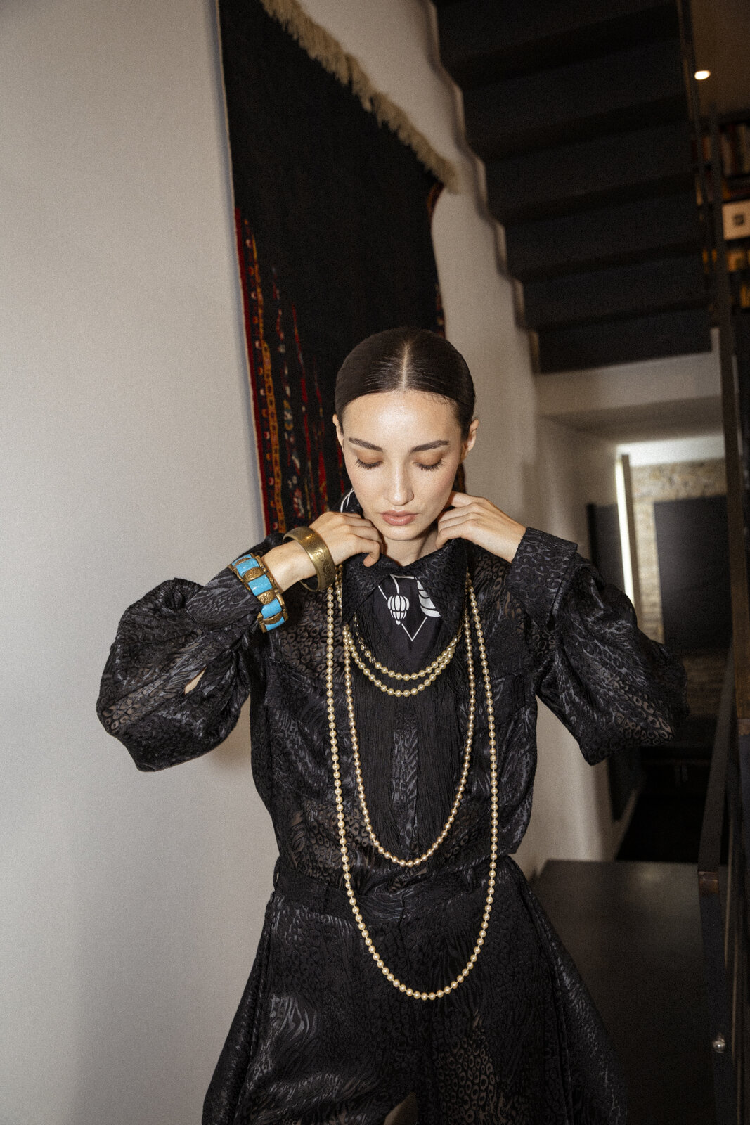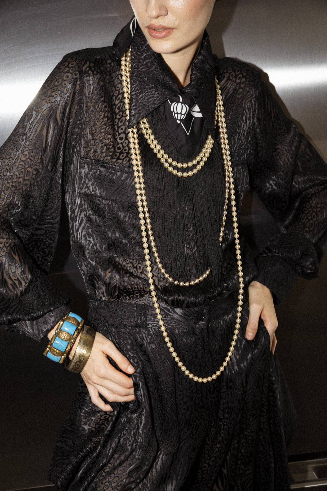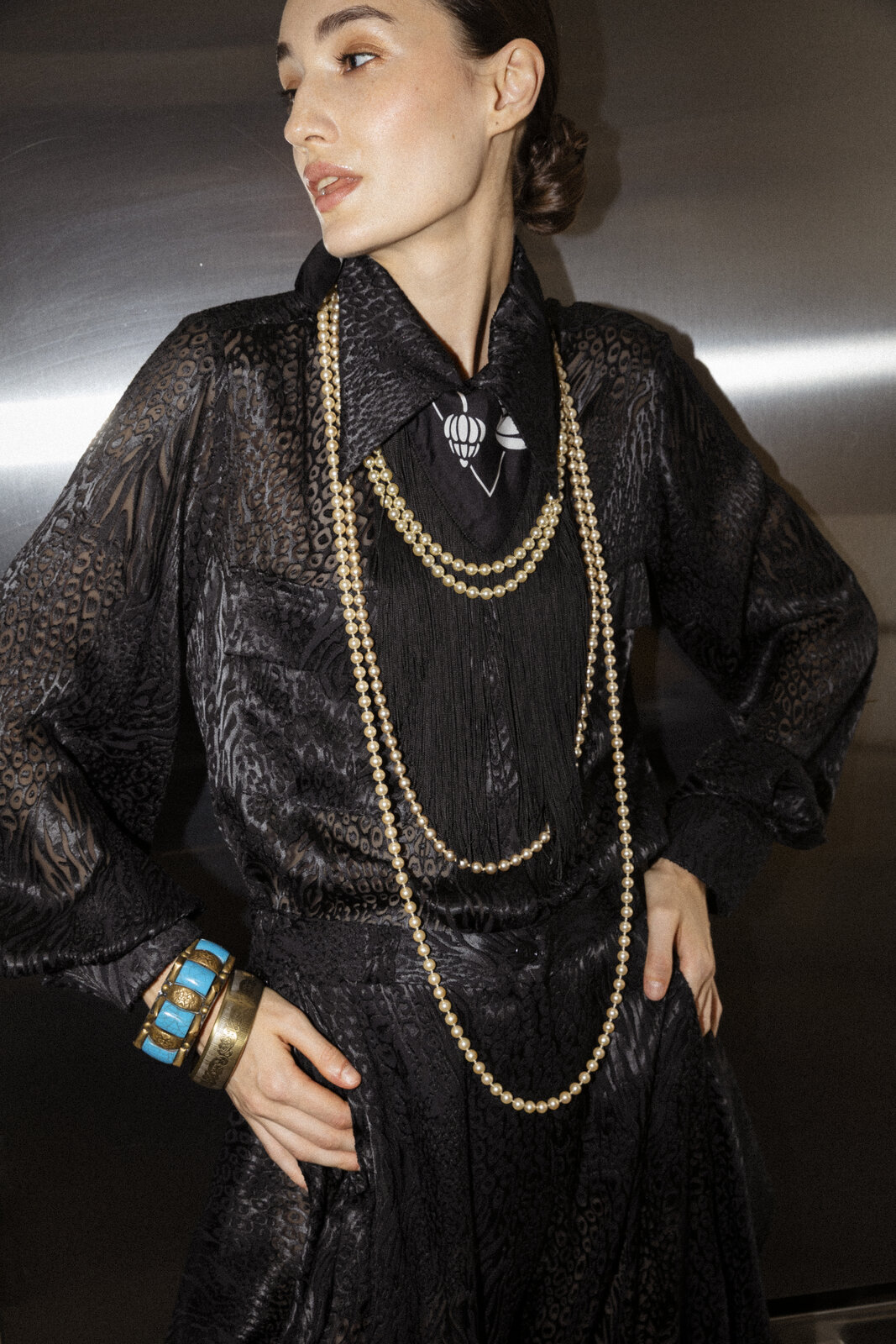 Realizzata in dévoré di pura seta, questa camicia dal taglio sartoriale ha lunghe e ricche maniche chiuse da alti polsi “alla francese”. lungo collo maschile, tasche applicate sul petto, abbottonatura centrale nascosta e sprone sul retro per aumentarne la vestibilità. Cuciture all’inglese. Made in Italy