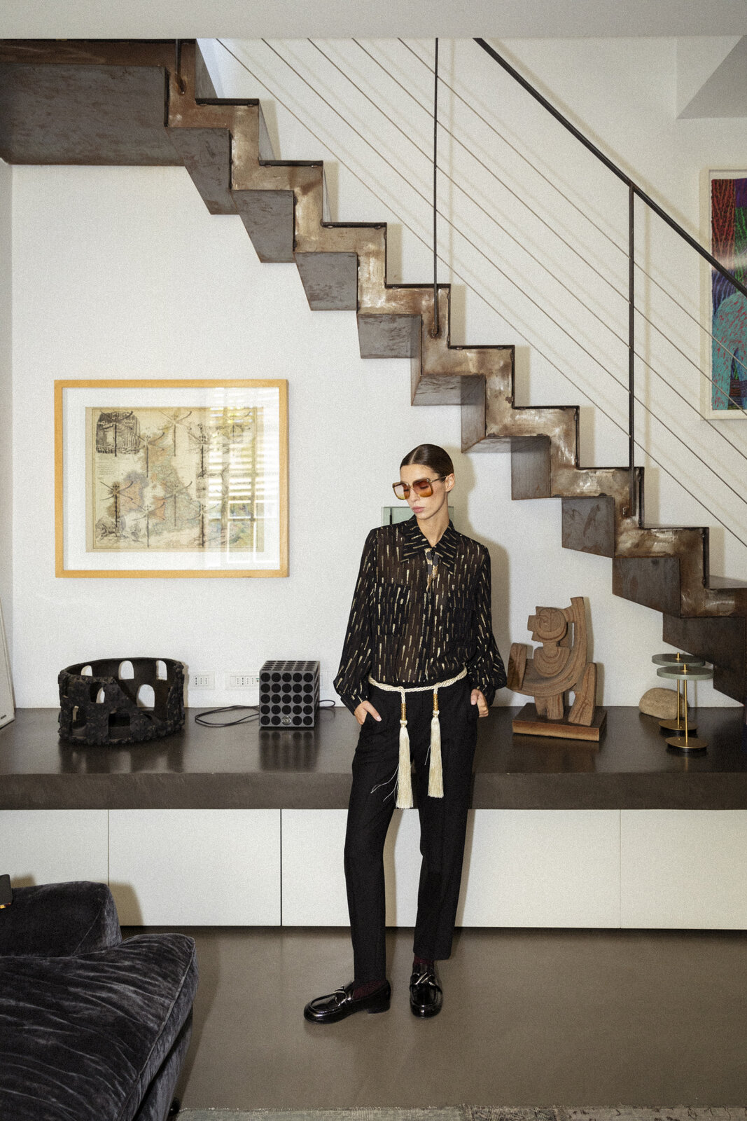 Realizzata in chiffon di pura seta punteggiato d’oro, questa camicia dal taglio sartoriale ha lunghe e ricche maniche chiuse da alti polsi “alla francese”. lungo collo maschile, tasche applicate sul petto, abbottonatura centrale nascosta e sprone sul retro per aumentarne la vestibilità. Cuciture all’inglese. Made in Italy
