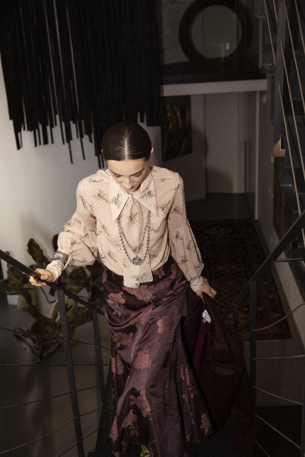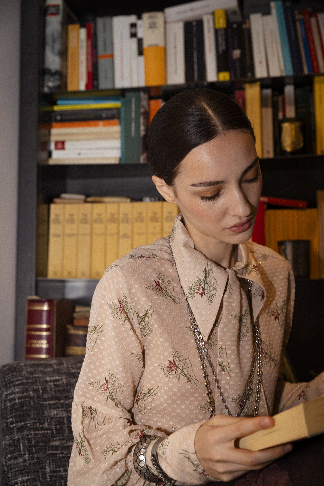 Realizzata in pura e morbida viscosa fantasia impreziosita in lurex, questa camicia sartoriale presenta lunghe maniche a sbuffo con alti polsi e un lungo colletto maschile. Presenta inoltre abbottonatura centrale nascosta, cuciture interne pulite con doppia cucitura e cuciture ribattute a mano. Look esclusivo e sofisticato. Cuciture interne pulite con doppia cucitura. Ampie maniche lunghe. Abbottonatura nascosta. Prodotto in Italia
