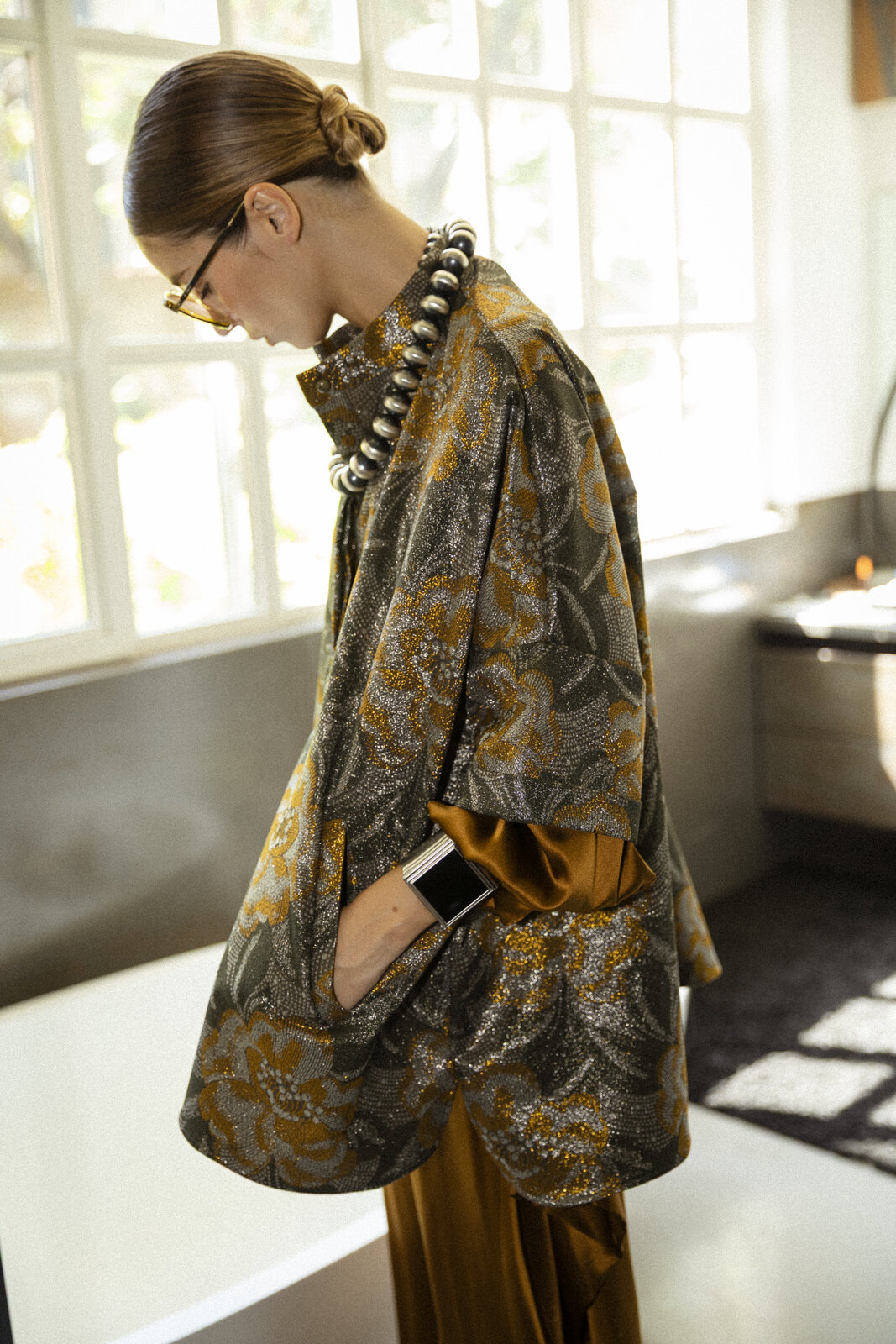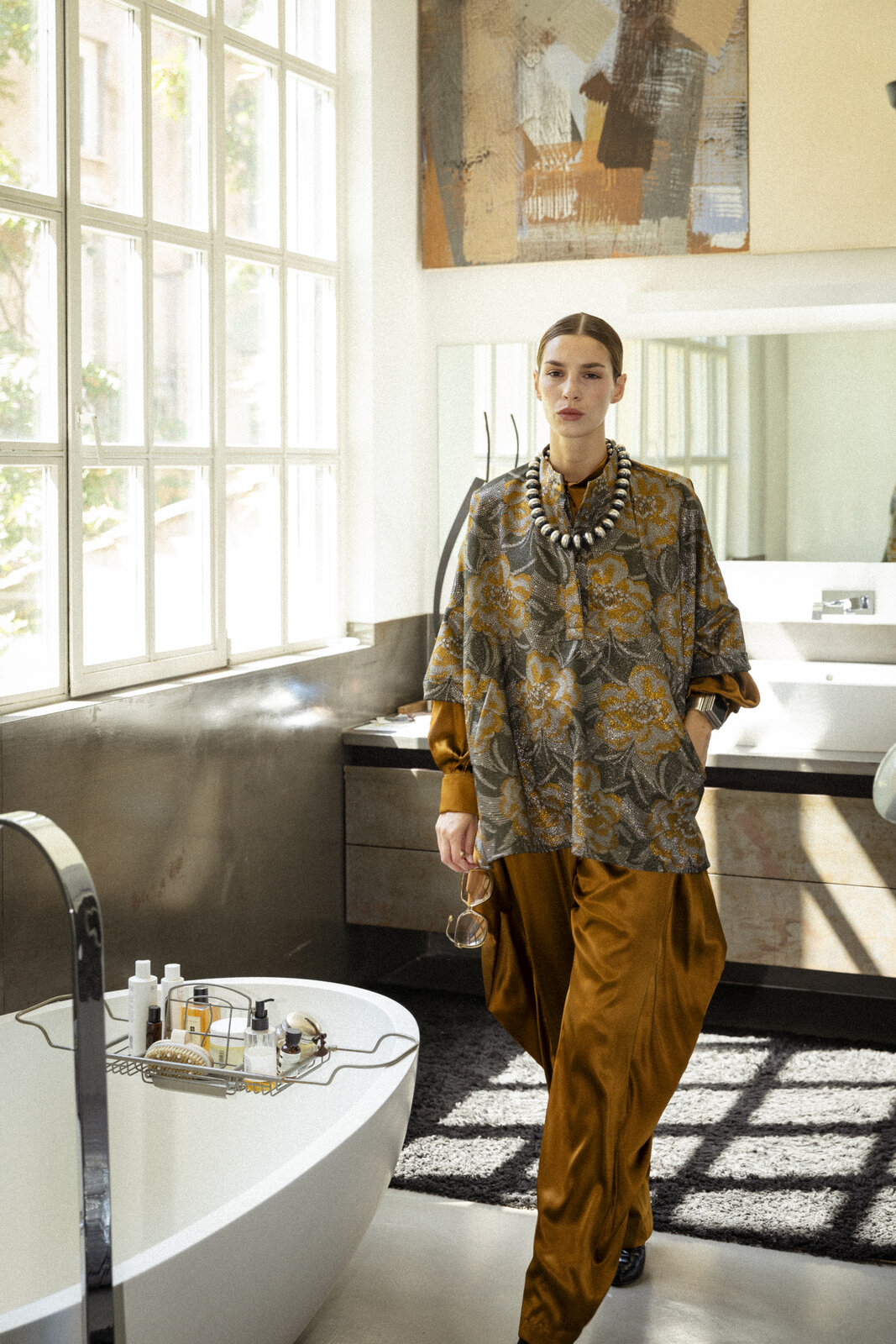 A must-have from the Morfosis Collections, this oversized shirt is crafted from a super precious jacquard in gold, silver and copper. It features a polo-style button closure with a mandarin collar, welt pockets, dropped shoulders, and 3/4 sleeves. One size. The generous fit allows it to be worn close to the skin as a shirt or as an elegant layer on top. The fabric comes from an ancient French weaving mill dedicated to sustainability.