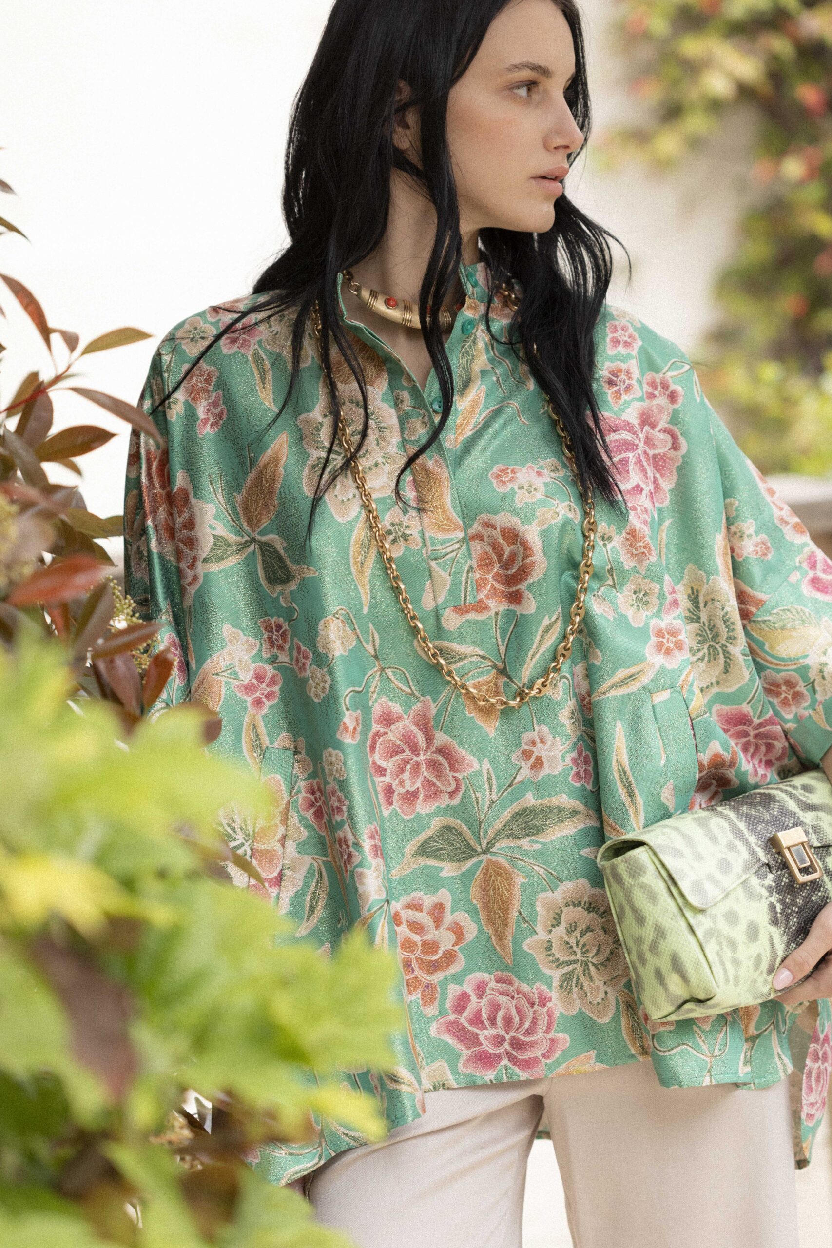 Realizzata in prezioso chiné di seta fantasia arricchito da lurex, questa camicia Morfosis dal volume ampio presenta abbottonatura a polo con collo alla coreana, tasche a filetto, spalla scesa e maniche 3/4. Taglia unica. La vestibilità generosa e confortevole consente di indossarla come camicia a capo unico oppure come elegante layer/sovracamicia. Il tessuto proviene da un’antica tessitura francese attenta alla sostenibilità.