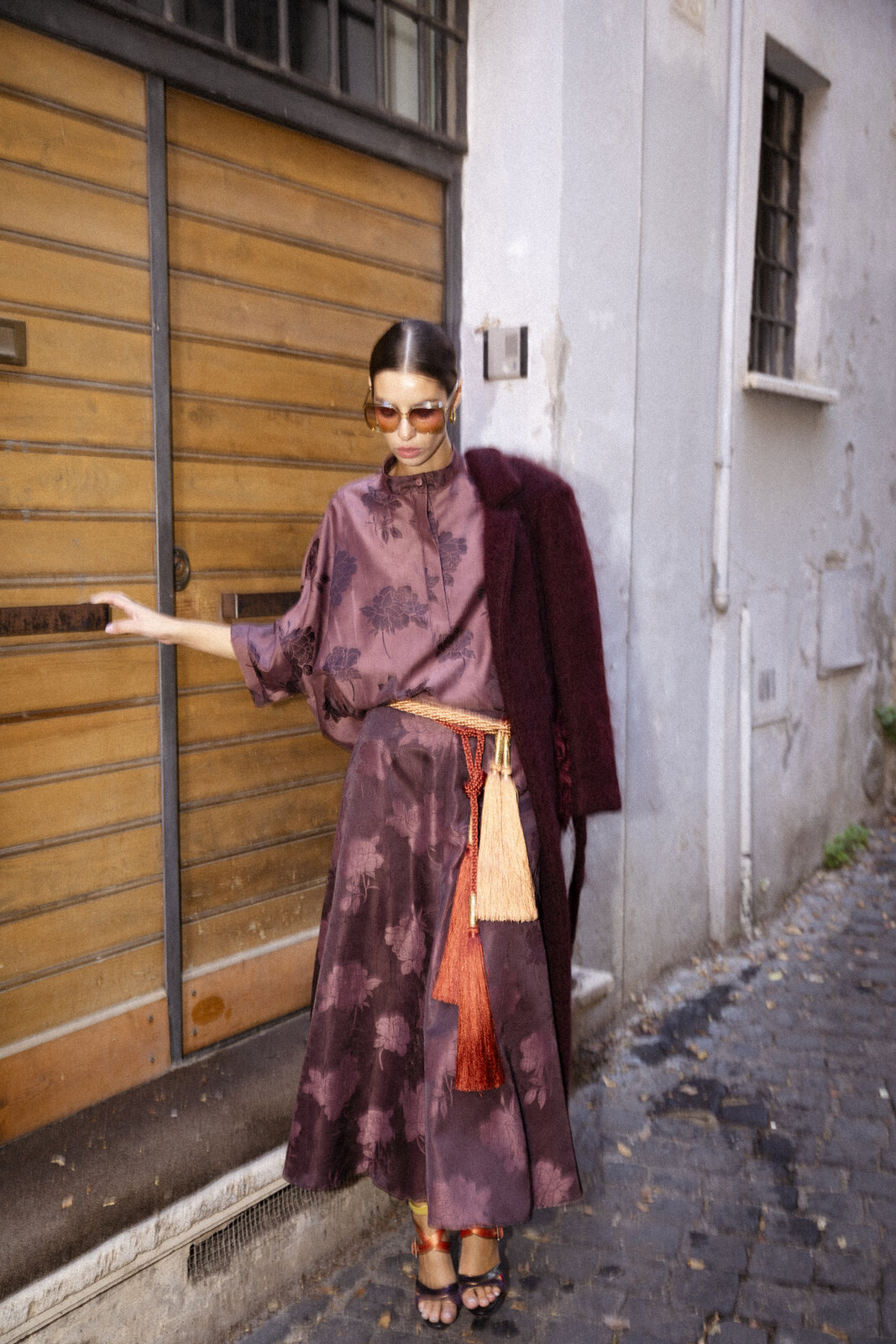 A must-have from the Morfosis Collections, this oversized shirt is crafted from precious tone-on-tone jacquard. It features a polo-style button closure with a mandarin collar, welt pockets, dropped shoulders, and 3/4 sleeves. One size. The generous fit allows it to be worn close to the skin as a shirt or as an elegant layer on top. The fabric comes from an ancient French weaving mill dedicated to sustainability.