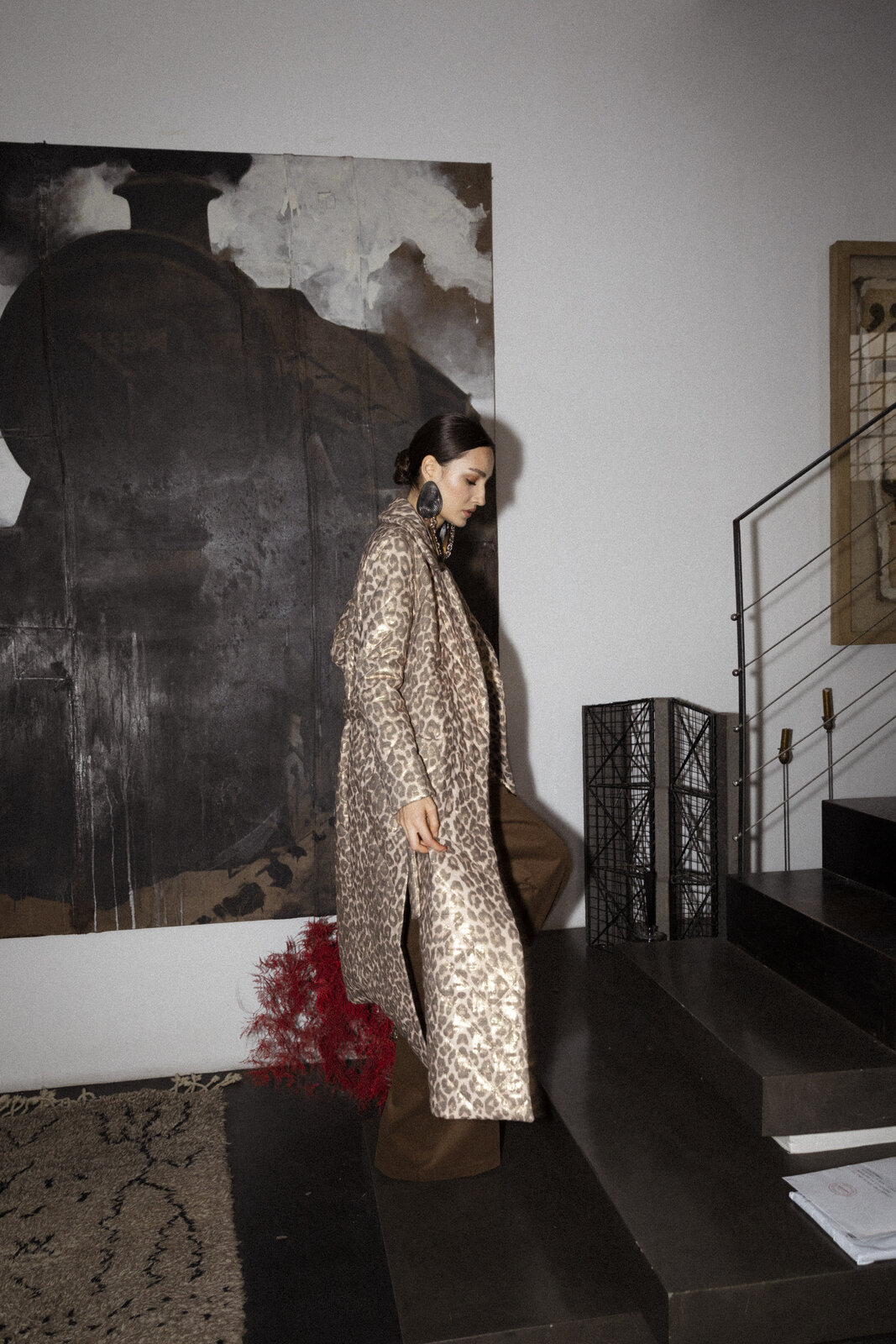 A coat in printed quilted canvas with a relaxed belt design, conceived for timeless elegance and destined to become your winter essential. It features a wide, plush collar, two front pockets in mohair fur, and generous side slits. Complete with a detachable belt for versatile styling. Fully lined and crafted in Italy.