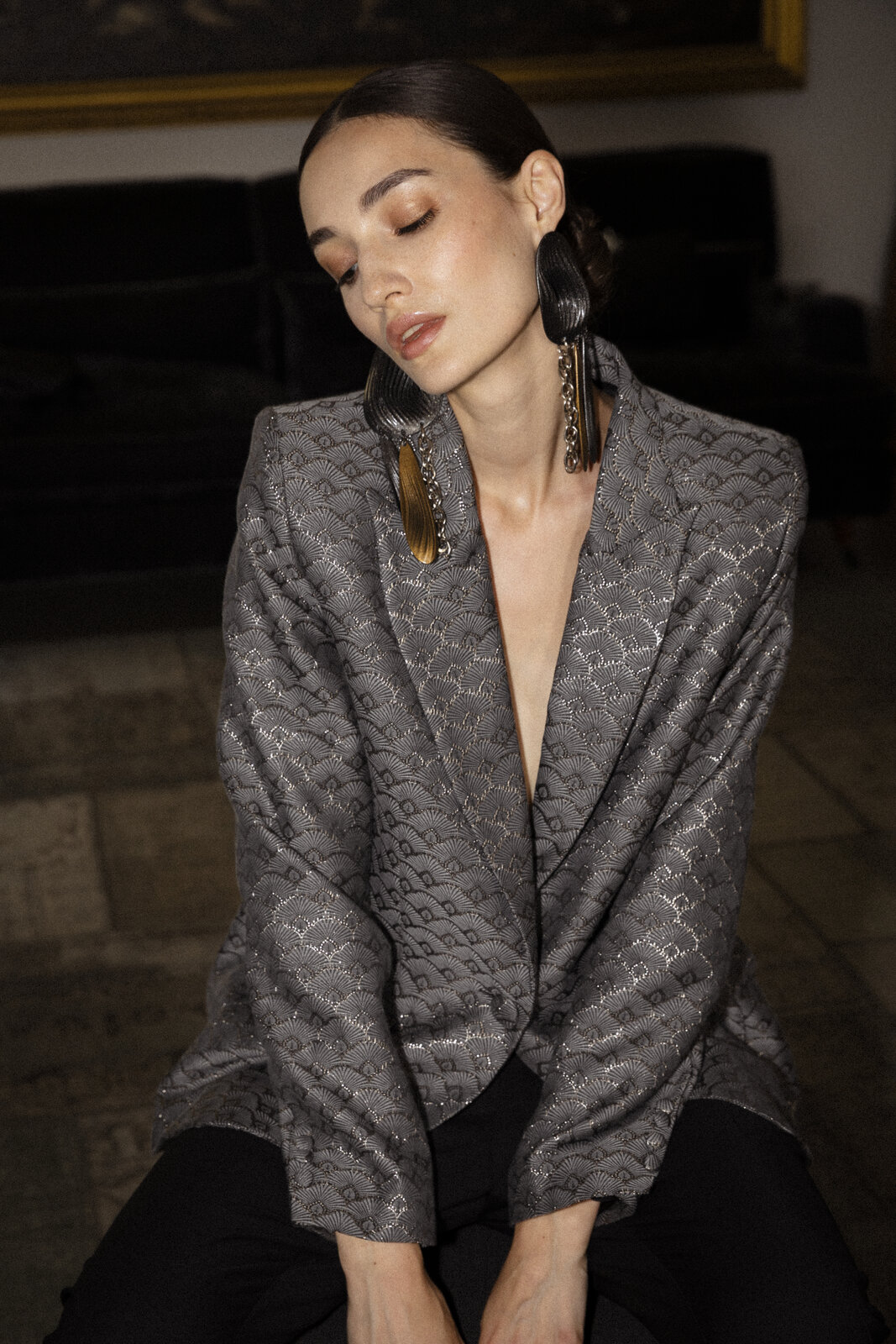 Sofisticata giacca dal taglio sartoriale realizzata con esclusivo jaquard fantasia che proviene da un’antica azienda francese che garantisce texture e disegni unici, complessi, con più trattamenti sovrapposti intrecciando fili di vario colore, su un apposito telaio che prende il nome dal suo inventore, J.M. Jacquard. Il monopetto ha spalline importanti, un singolo bottone, ampi revers e tasche con pattina. Foderata. Made in Italy.