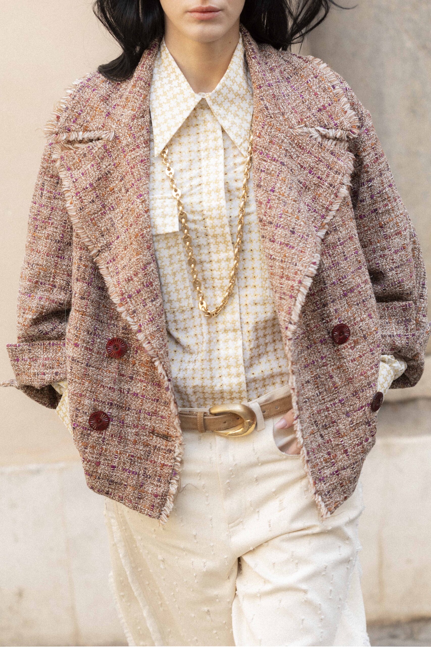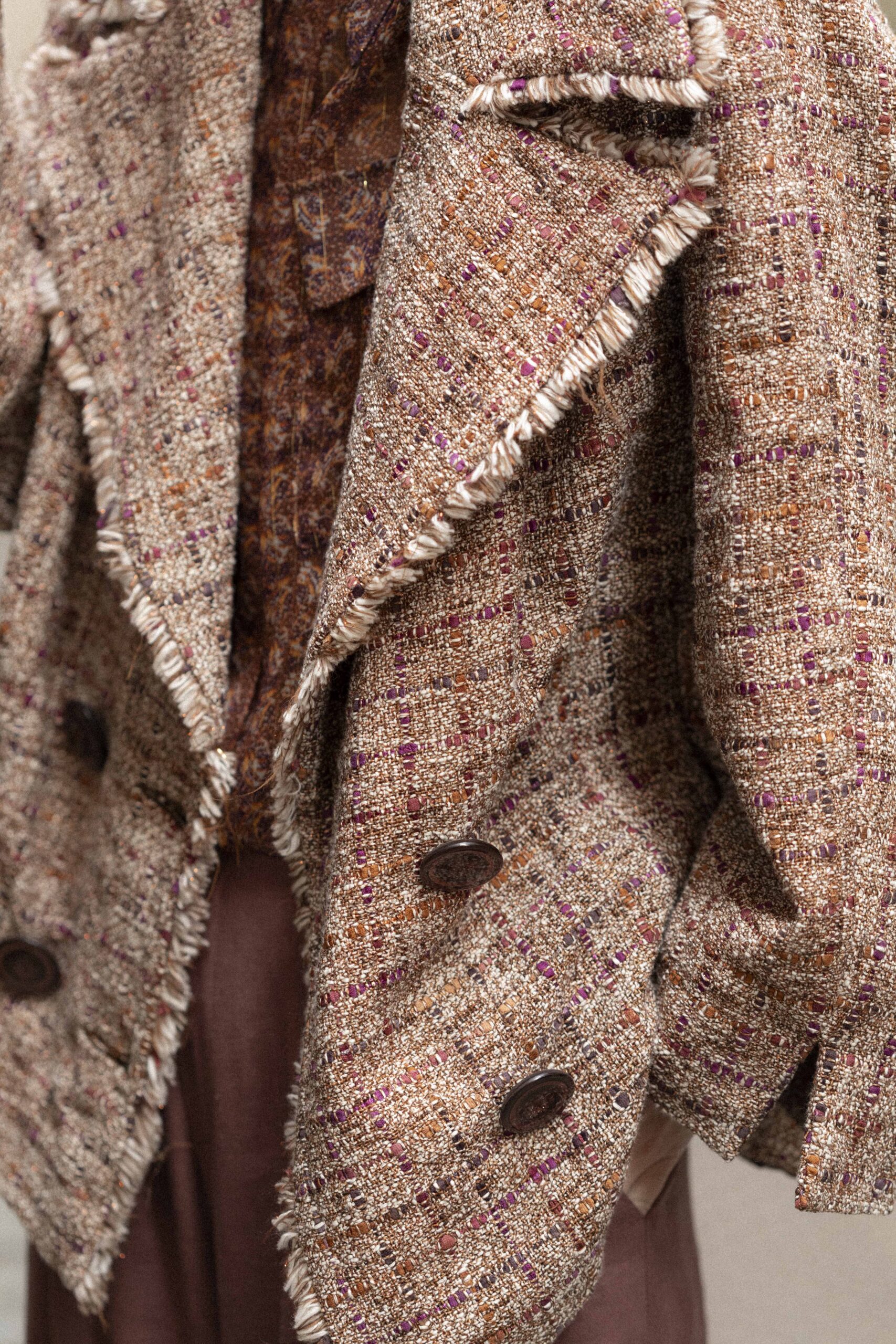 Crafted in precious Chanel-style tweed sourced from a heritage English mill—renowned for intricate textures and complex patterns created by weaving different types of yarns and colours on dedicated looms with layered finishing processes—this double-breasted jacket balances glamour and refinement. Designed for a comfortable, wrap-around fit, it features wide lapels and an exclusive vintage-button front closure.