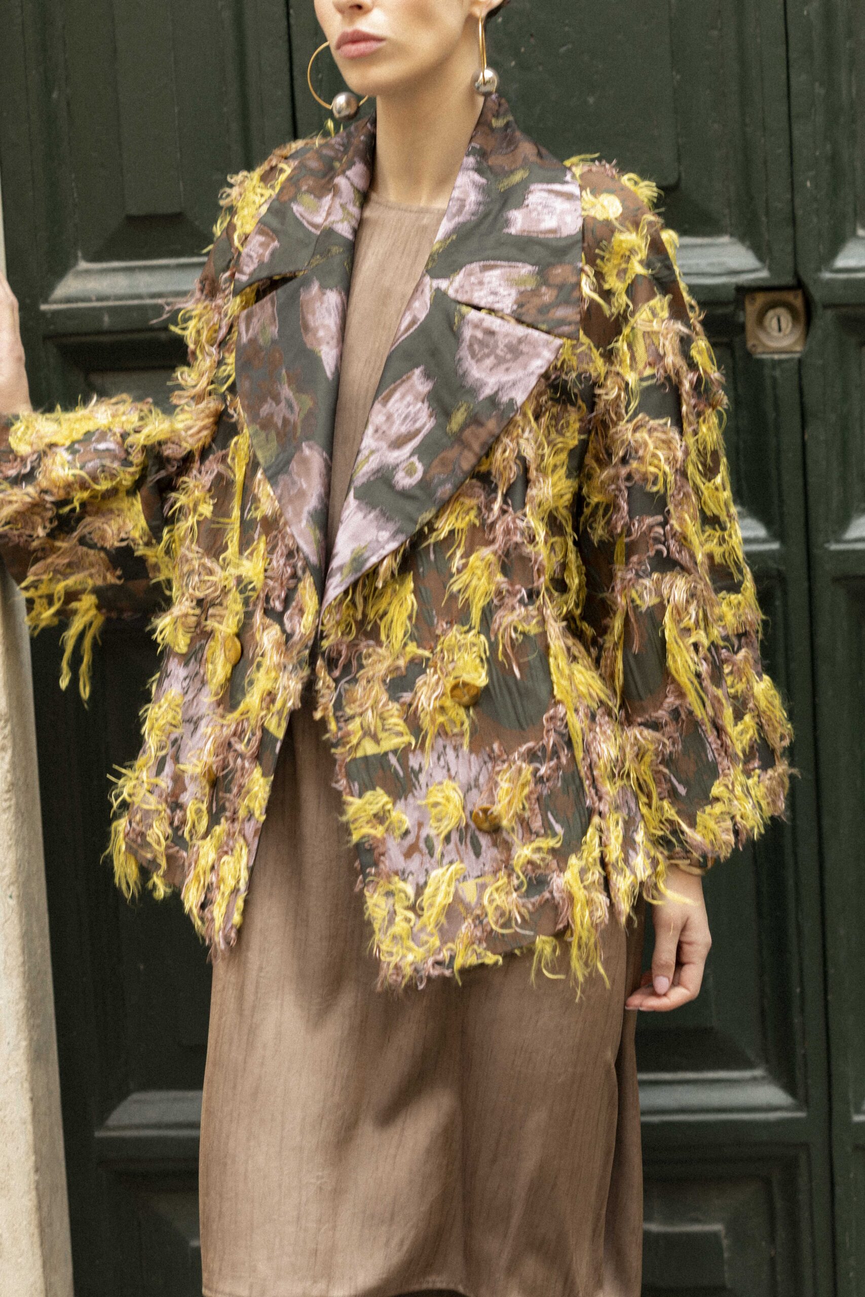 Realizzata in esclusivo jacquard agugliato: texture e disegni complessi nascono dall’intreccio di diversi filati e da lavorazioni stratificate su telai jacquard, che prendono il nome dal loro inventore J.M. Jacquard. Progettata per una vestibilità comoda e avvolgente, presenta ampi rever e una chiusura frontale con esclusivi bottoni vintage.