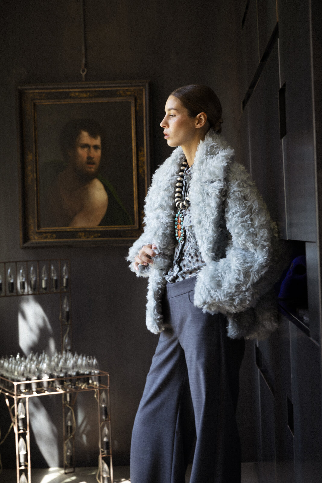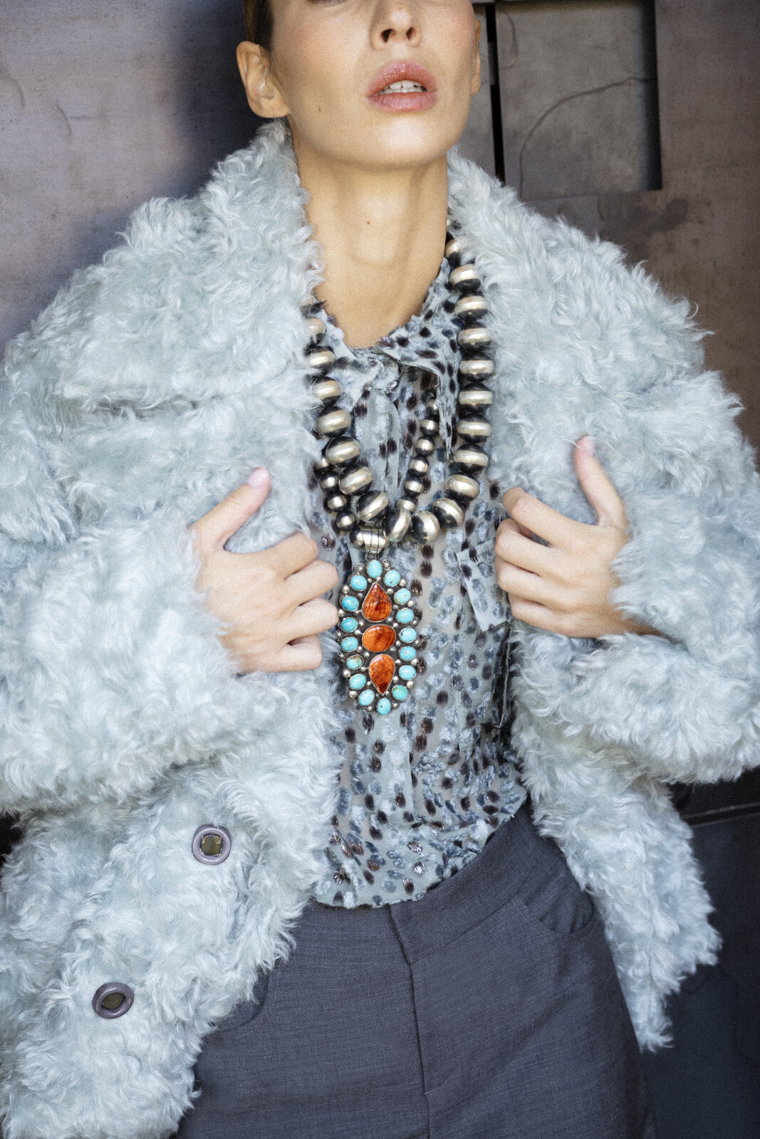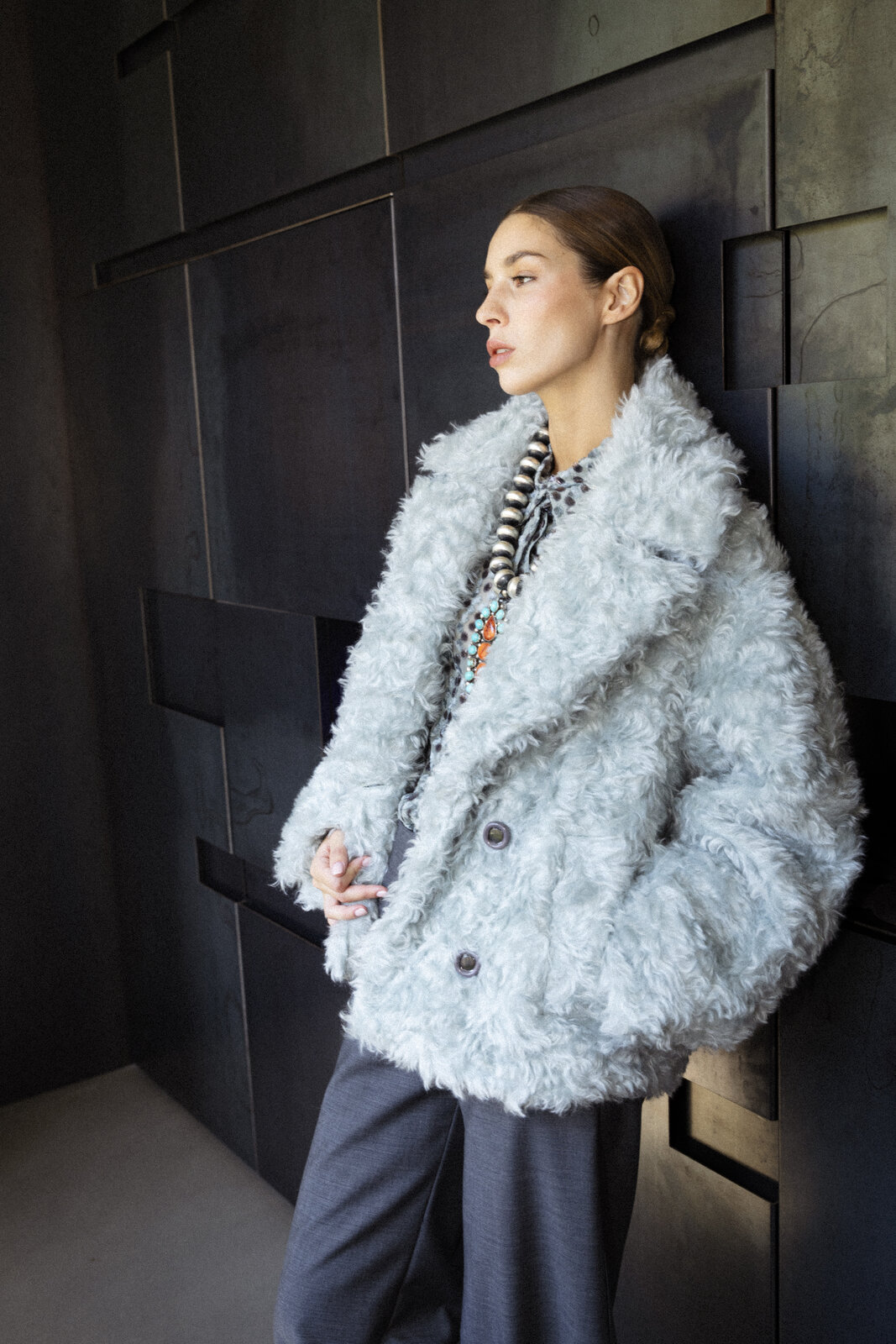 Crafted from precious fur produced by responsible and not mulesed mohair wool, this oversized double-breasted jacket embodies both glamour and refinement. Designed for a relaxed fit, it features wide lapels and exclusive front buttons. The fabric is sourced from a historic european mill, ensuring a sustainable product of enduring value.