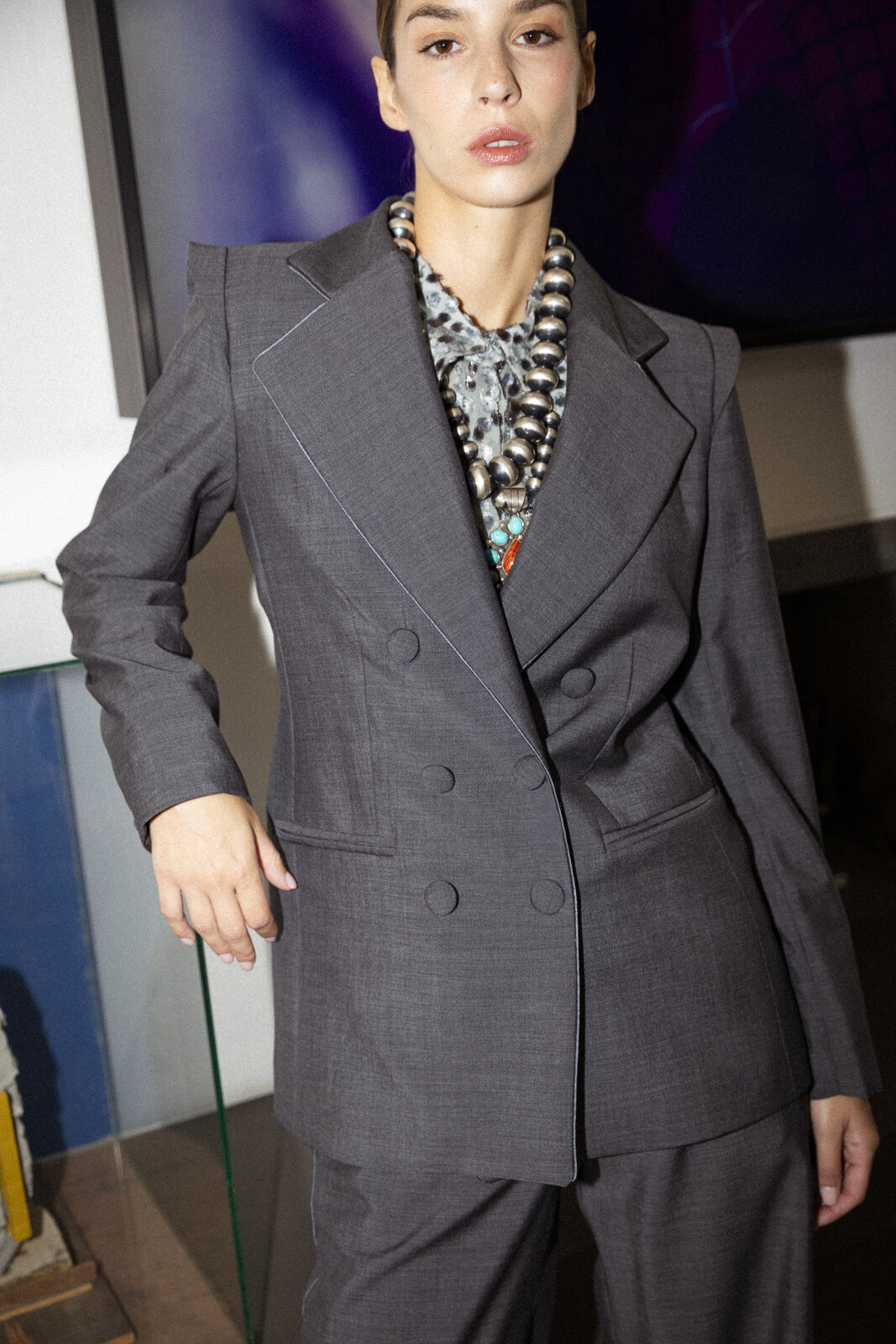 Timeless tailoring remains at the heart of the collections. Crafted from soft wool grisalille, this demi screwed double-breasted jacket features structured shoulders, wide satin peak lapels, and and piping-accented cuts that gently embrace and enhance the silhouette. Six buttons, fully lined. Made in Italy.