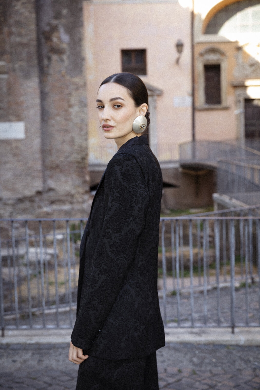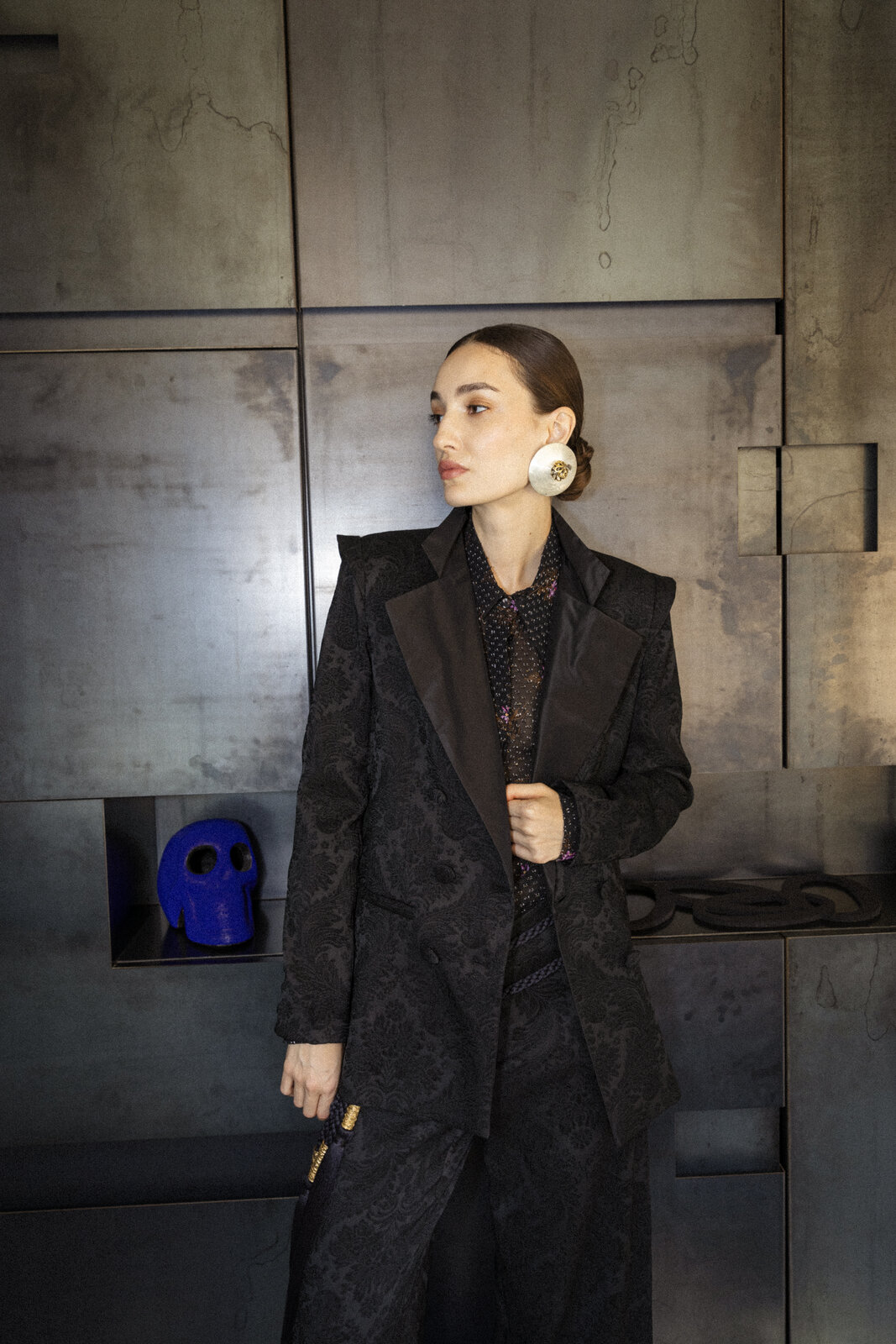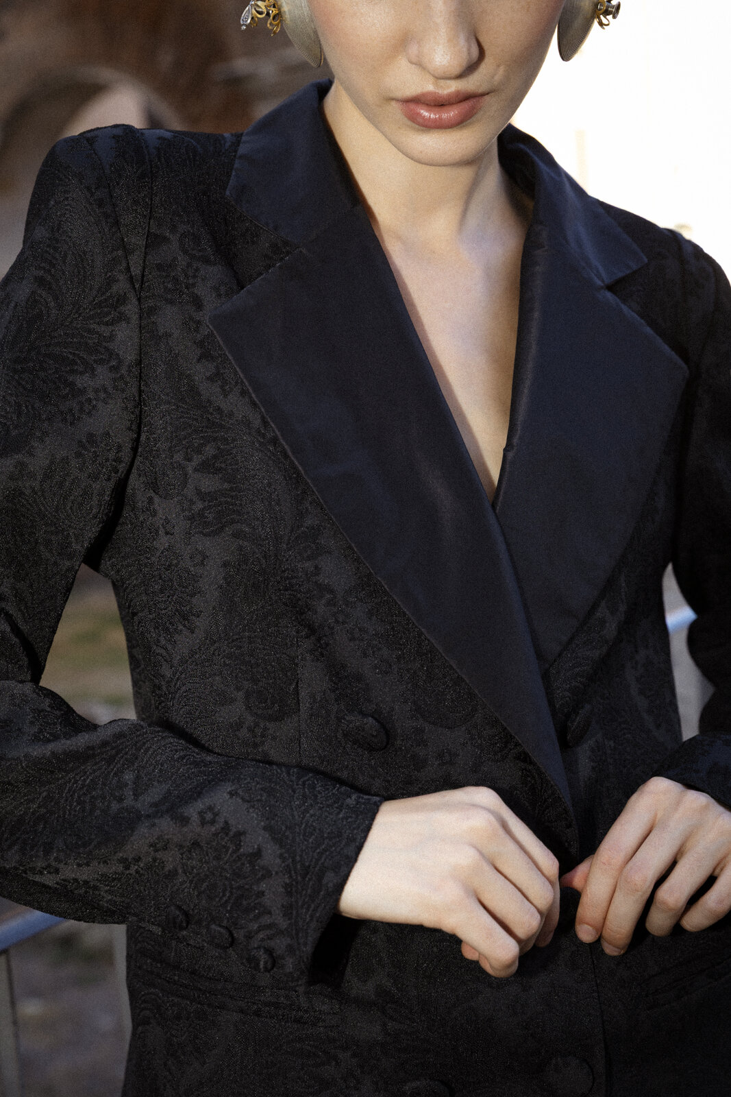 Timeless tailoring remains at the heart of the collections. Crafted from soft black jacquard, this demi screwed double-breasted jacket features structured shoulders, wide satin peak lapels, and cuts that gently embrace and enhance the silhouette. Six buttons, fully lined. Made in Italy.