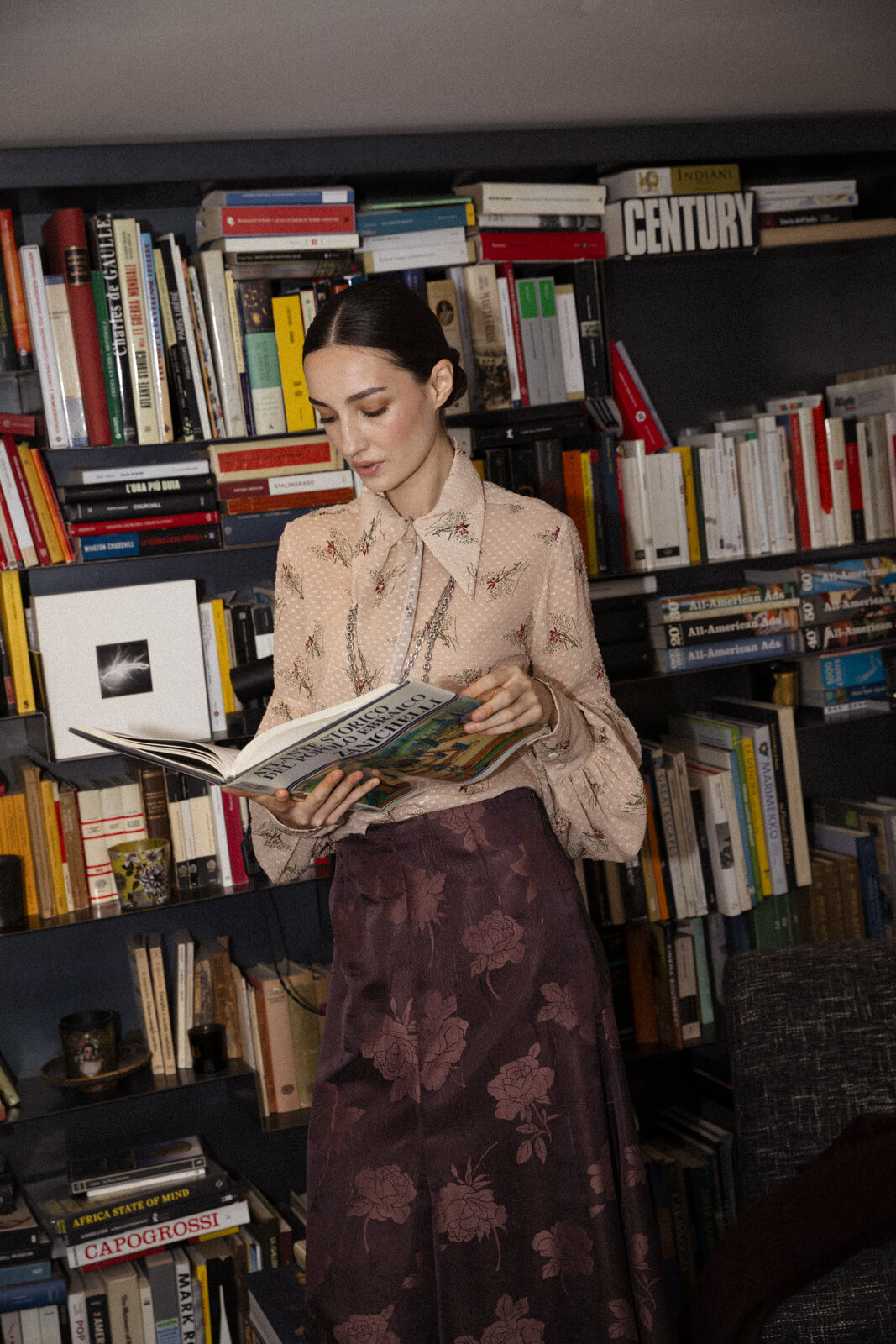Made from luxurious jacquard tone sur tone, this tailored midi skirt brings elegance and fluid movement to every silhouette. Featuring panels with front and back center slits, fully lined, and finished with refined English seams. Made in Italy.