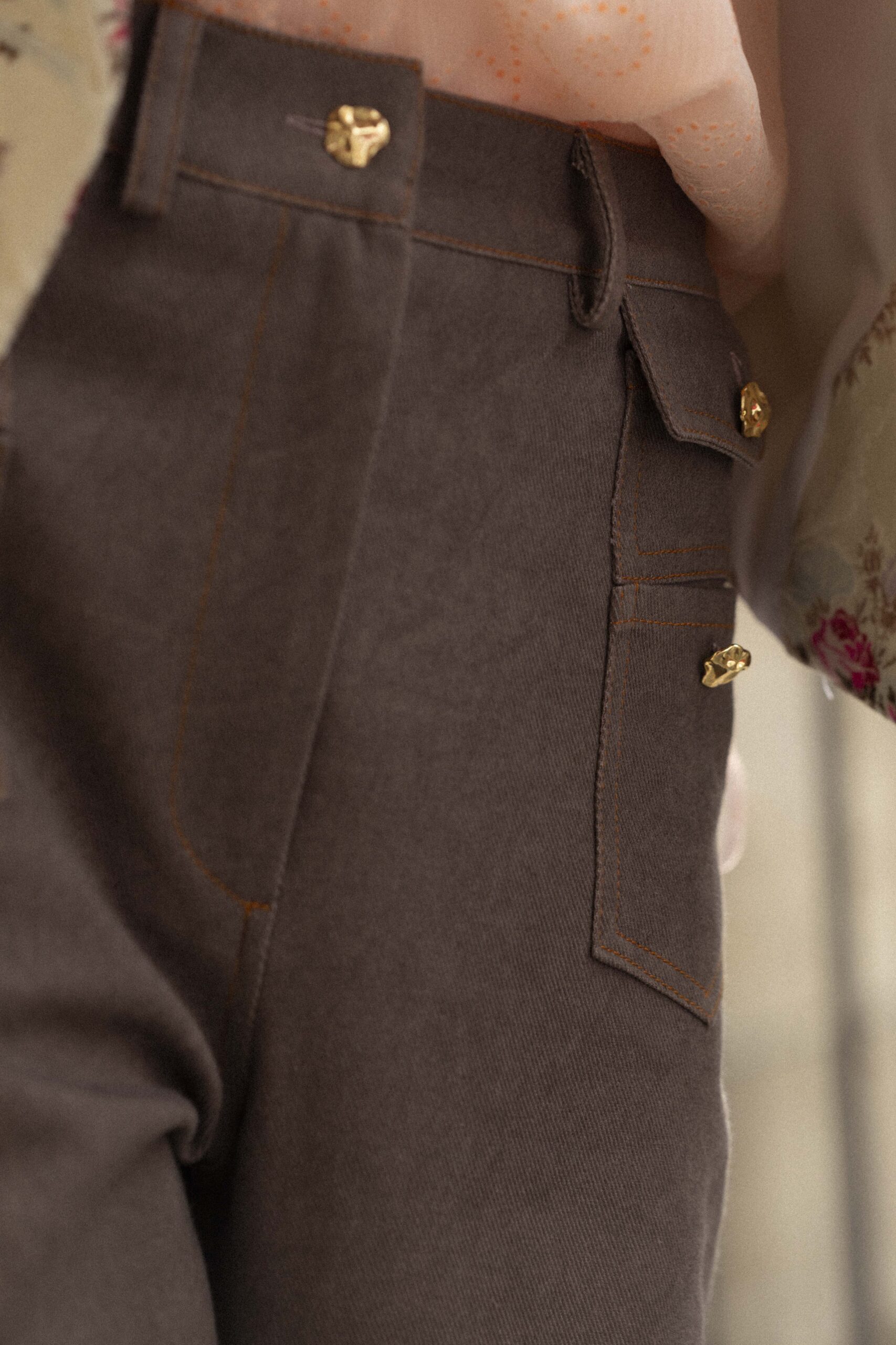 High-waisted pants designed to define and elongate the silhouette, with a leg that subtly widens toward the hem for a modern flare effect. Featuring four small front pockets embellished with distinctive jewel buttons, plus two back pockets. Finished with double topstitching throughout to highlight the construction and add character.