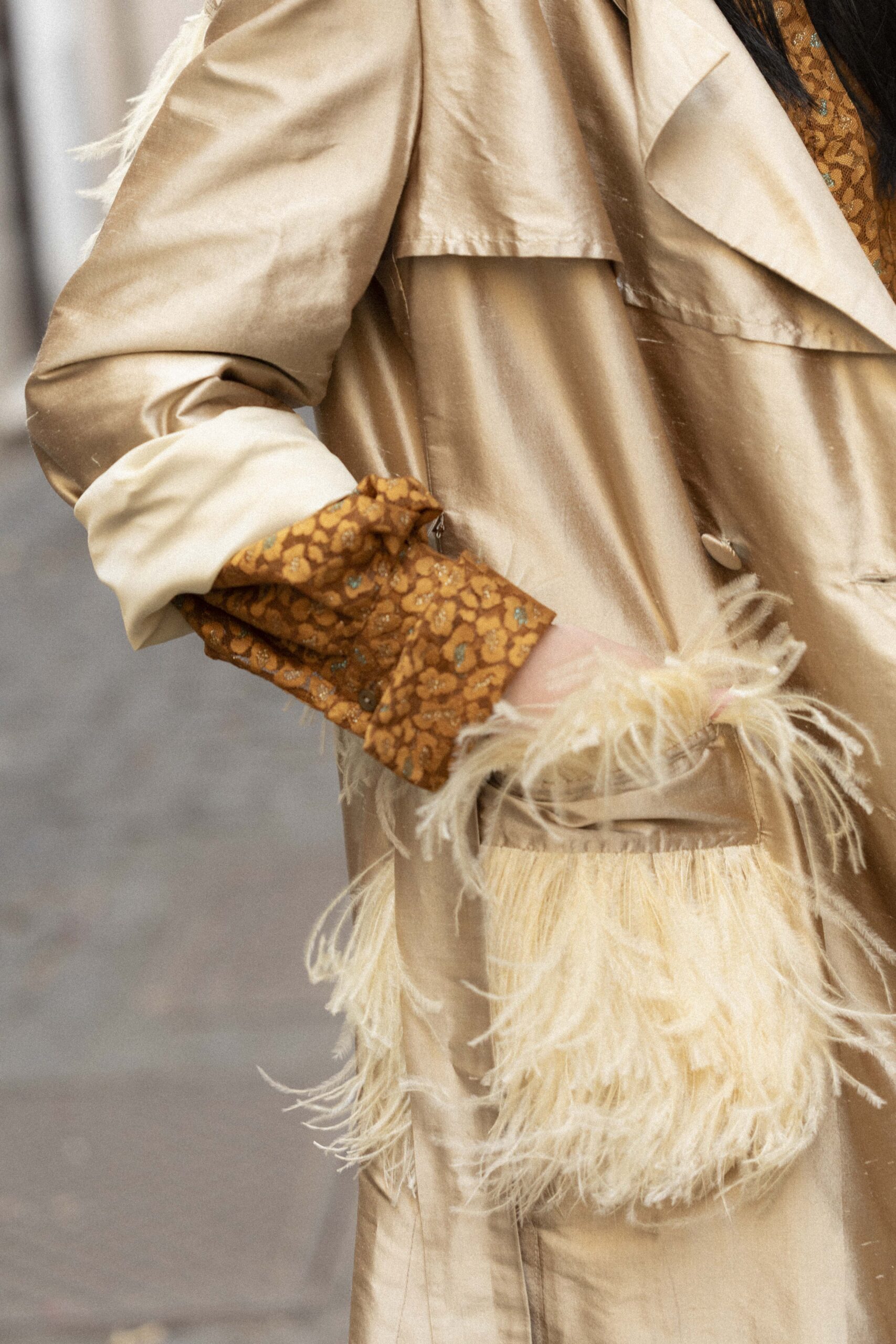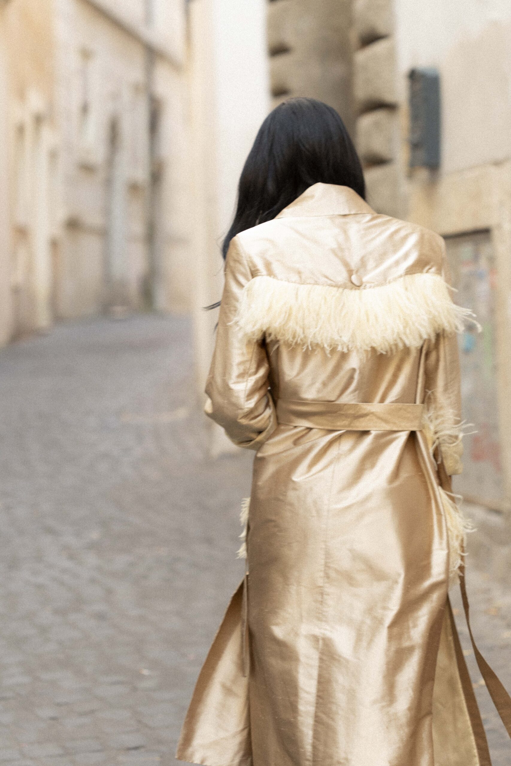 Trench avvolgente in shantung di pura seta, dal carattere prezioso e contemporaneo. Completamente foderato, è impreziosito da piume di struzzo cruelty-free applicate su tasche e carré, per un dettaglio scenografico ma raffinato. La vestibilità ampia e disinvolta trasforma l’abbigliamento quotidiano in un gesto unico, da indossare con naturalezza.